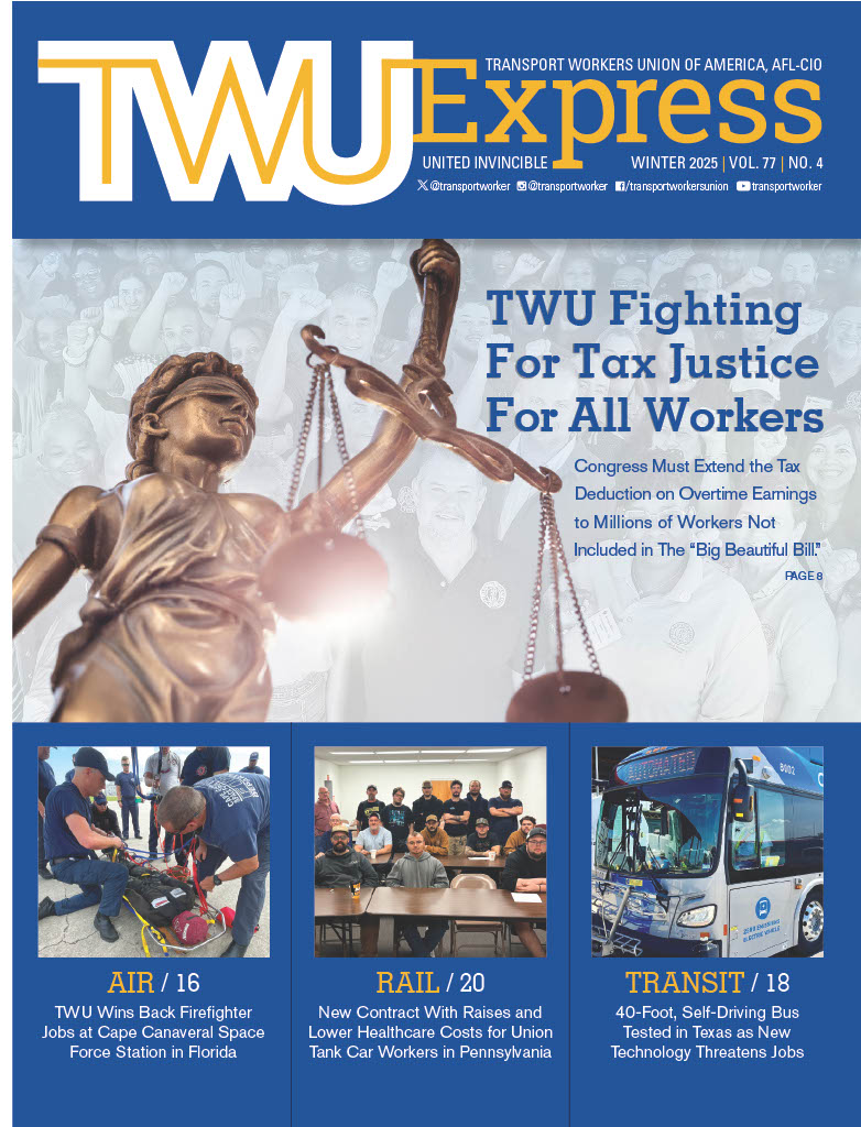 The latest Express is Here. Read how the TWU is pushing to get the overtime tax deduction extended to all members, and updates from all divisions, including regaining firefighter jobs at Cape Canaveral, a new freight rail contract in Pennsylvania, and the ongoing threat from automation.